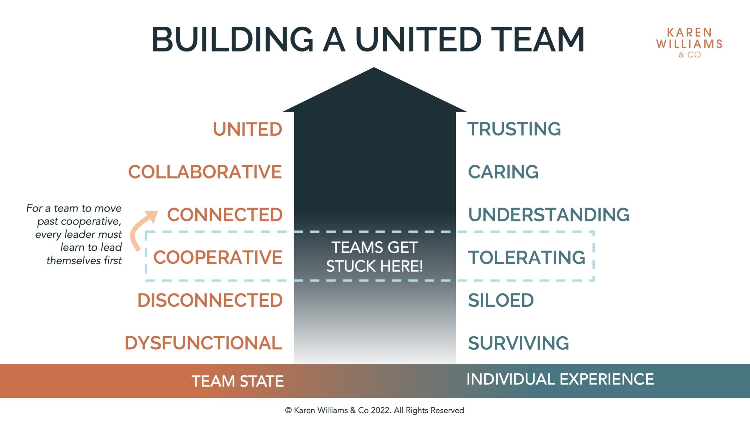 To move from being a Cooperative team to being a Collaborative and ultimately a United team, every person must be leading themselves first. This is when culture begins to make a positive and transformative shift in a way that’s sustainable. Without a culture of self-leadership, under stress people will default to blaming each other for mistakes, they won’t feel safe to fail, learn and try again, and will wait for instructions rather than risk making decisions.